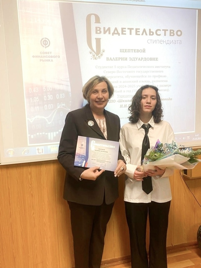 Руководитель школы, Наталия Николаевна Гавриленко, вручила стипендию Одонову Николаю. Магистранту кафедры перевода и межкультурной коммуникации БГУ им. Д. Банзарова.