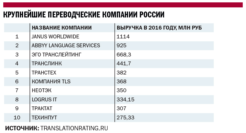 Переводческий бизнес в нашей стране сильно фрагментирован — на рынке работают несколько тысяч небольших компаний. Российский портал Translation Rating оценивает совокупный объем бизнеса российских переводческих компаний в 17 млрд руб. В прошлом году Janus Worldwide заняла 45-е место в мировом рейтинге The Top 100 Language Service Providers, который составляет Common Sense Advisory. Еще одна российская компания — ABBYY LS — на 50-м месте. Около 85% выручки нам приносят международные клиенты, в этом году мы вырастем почти на 20—25% по сравнению с 2016 годом. Наша цель — войти в топ-30 мировых переводческих компаний, и, надеюсь, технологии нам в этом помогут.