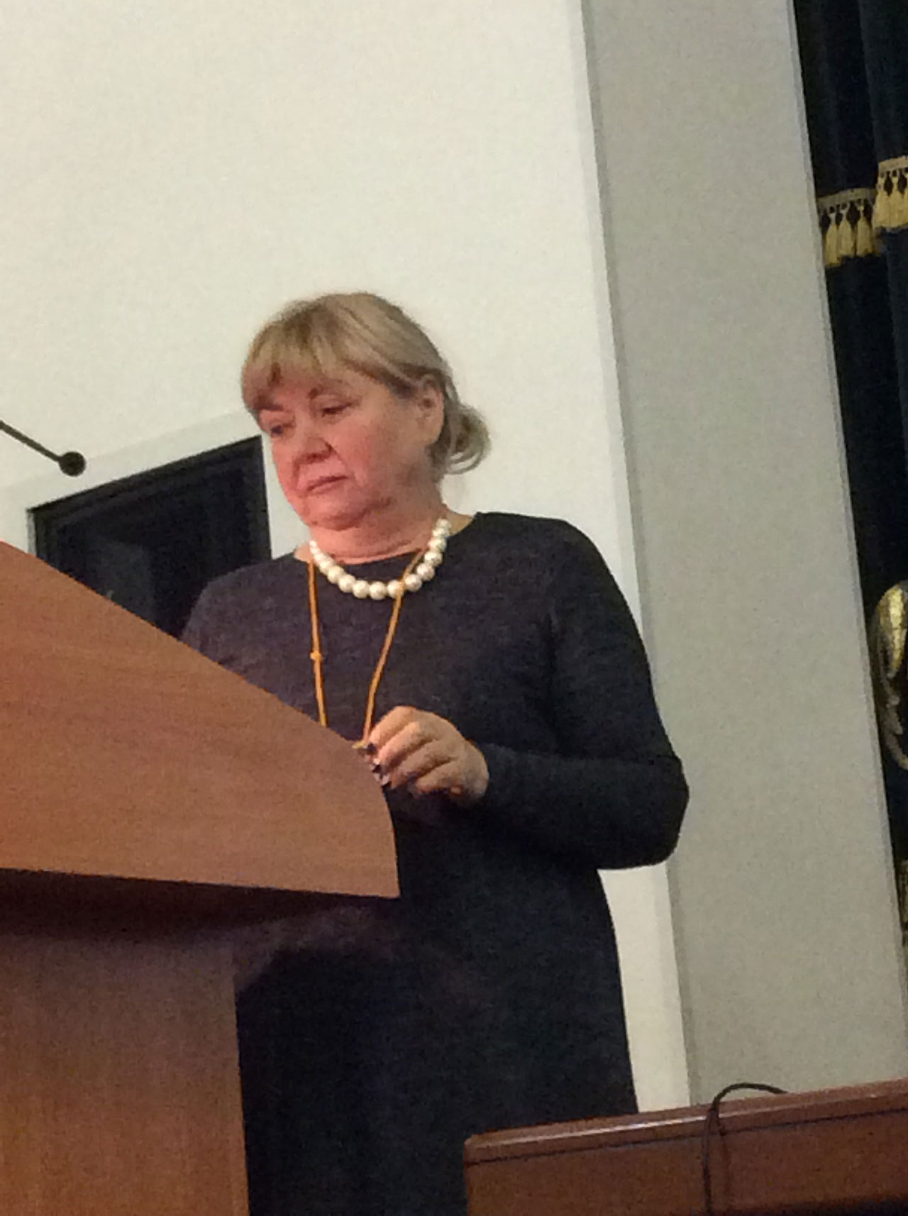 После кофе-паузы совещание продолжила Ильнара Алиевна Гусейнова, д.ф.н., проректор по научной работе МГЛУ, которая поприветствовала собравшихся и отметила, что познакомившись с профессией переводчика, она поняла, что переводчиков возможно или «прибить», или «полюбить». Заверила всех в своей искренней любви к переводчикам, отметила необходимость структурирования пространства обучения, пожелала всем успехов и хорошего настроения. Не осталась на трибуне, а «ушла к народу».