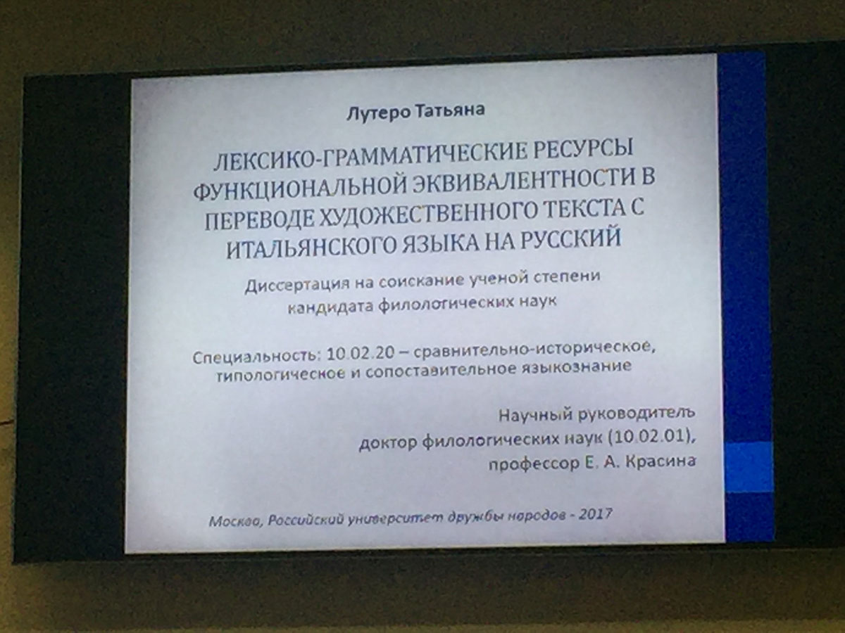 Сегодня в диссертационном совете Российского университета дружбы народов успешно прошла защита кандидатской диссертации Татьяны Лутеро «Лексико-грамматические ресурсы функциональной эквивалентности в переводе художественного текста с итальянского языка на русский» по специальности 10.02.20 – Сравнительно-историческое, типологическое и сопоставительное языкознание. Функциональная эквивалентность рассматривалась диссертантом на примере анализа переводов произведений одного из крупнейших современных итальянских писателей - А. Барикко на русский язык. Проанализированы возможности передачи образности в художественных текстах, доказано, что в процессе перевода этих текстов функциональная эквивалентность реализуется в описательных, повествовательных и диалогичных фрагментах художественного текста, а также при воссоздании образов персонажей. В работе гармонично переплетаются практические результаты деятельности переводчиков художественных текстов и теоретические постулаты функциональной лингвистики. Результаты данной работы могут быть использованы при обучении будущих переводчиков, желающих связать свою профессиональную жизнь с литературными переводами.