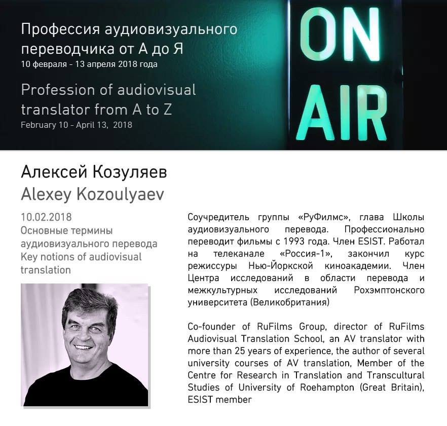 АЛЕКСЕЙ КОЗУЛЯЕВ: Аудиовизуальный перевод – особый вид перевода, отличающийся от устного и письменного. И у него есть своя базовая терминология. Без знакомства с ней очень трудно понять, чему же на самом деле должен учиться аудиовизуальный переводчик.